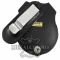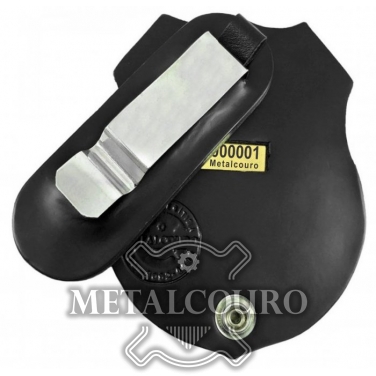 - No verso tem um gancho tipo mola em aço temperado de alta resistência. Vai com banho niquelado medindo 16 mm largura, para fixa-lo com firmeza ao cinto;