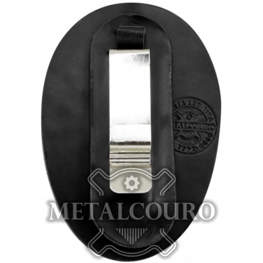 - No verso tem um gancho tipo mola em aço temperado de alta resistência. Vai com banho niquelado medindo 16 mm largura, para fixa-lo com firmeza ao cinto;